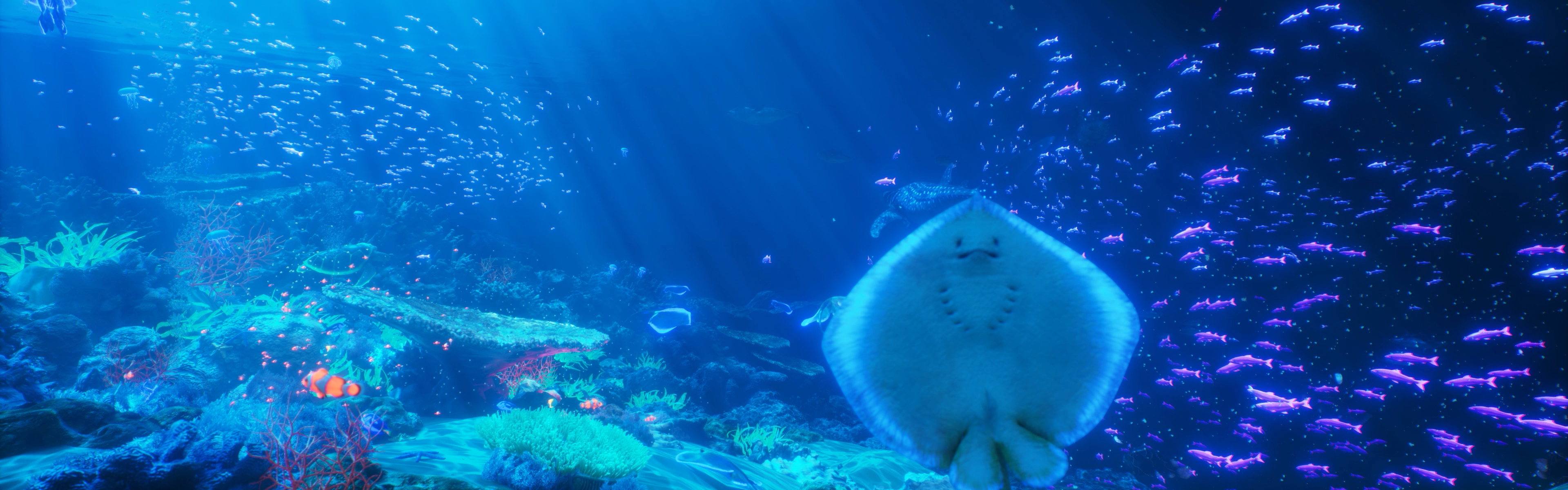 海洋成為我們敘事的起點,觀眾將體驗一段連續而漸進的下潛之旅。故事從熟悉的海面展開,陽光透過水面灑下斑駁光影,營造溫暖明亮的開場氛圍。隨著視線逐步深入,海洋世界的豐富生態開始展現—巨型水母優雅漂浮,繽紛魚群在珊瑚礁間靈動穿梭,共同編織出一幅生動的海底圖景。