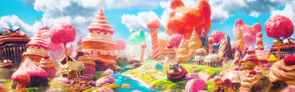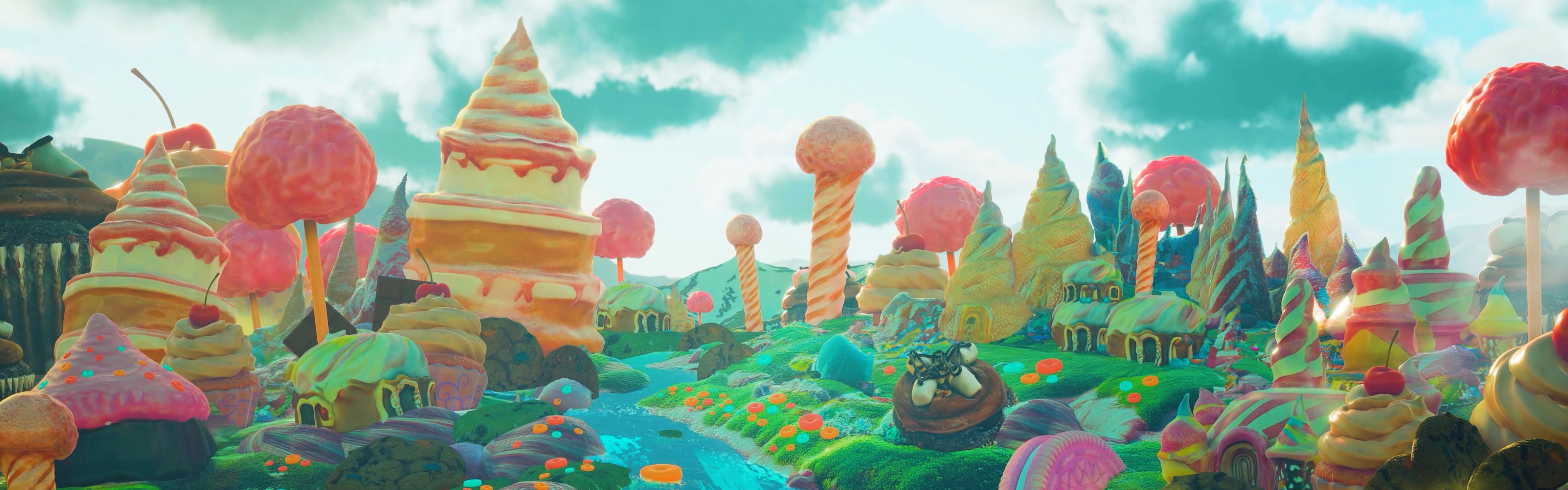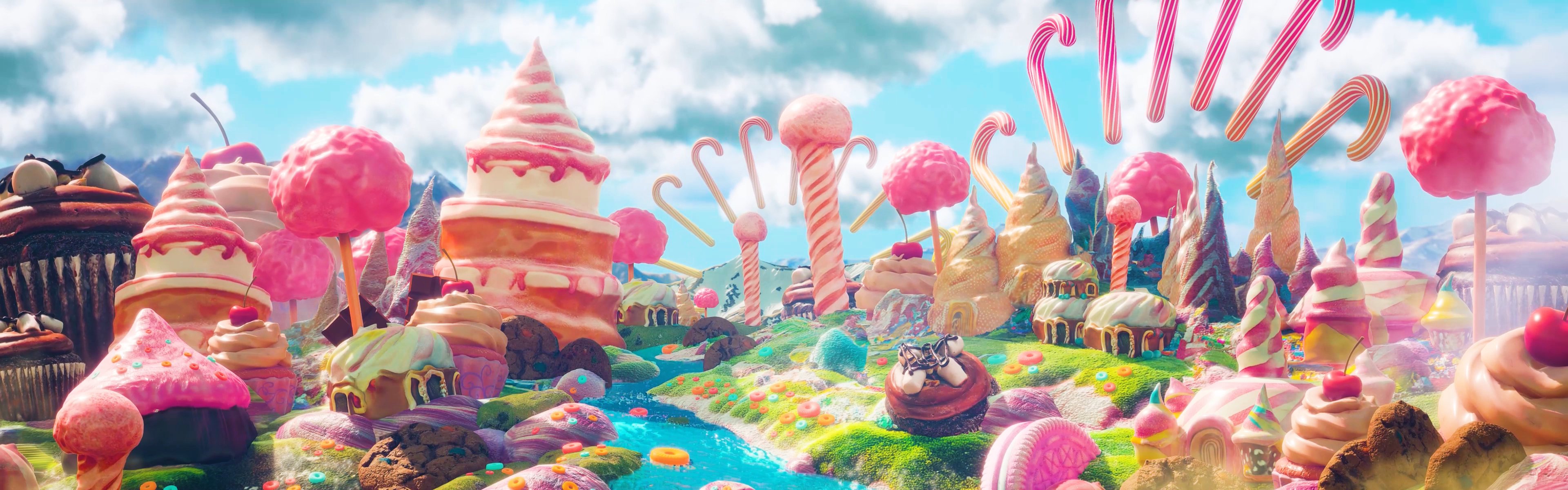 最終的降落地點是一個完全由糖果構築的夢幻王國。巧克力連綿的山脈、飄浮的棉花糖雲朵、閃爍的彩虹糖建築,以及造型可愛的甜甜圈樹木,共同營造出一個充滿童趣驚喜的甜蜜世界。這場從深海秘境到宇宙糖果王國的奇幻旅程,最終在純真與想像的國度中完美落幕。