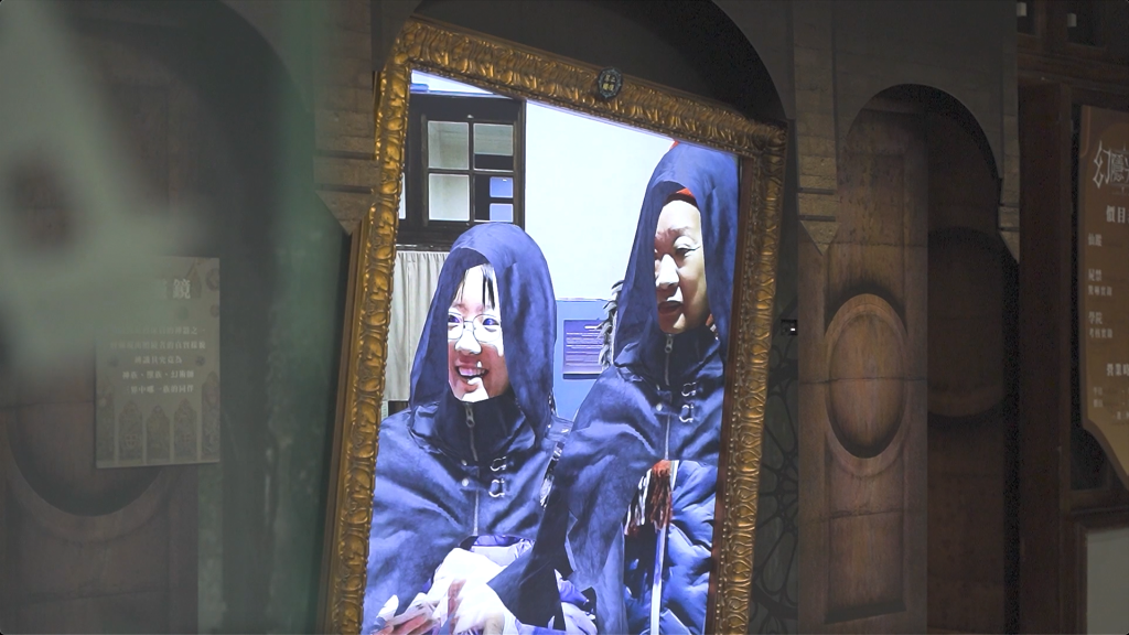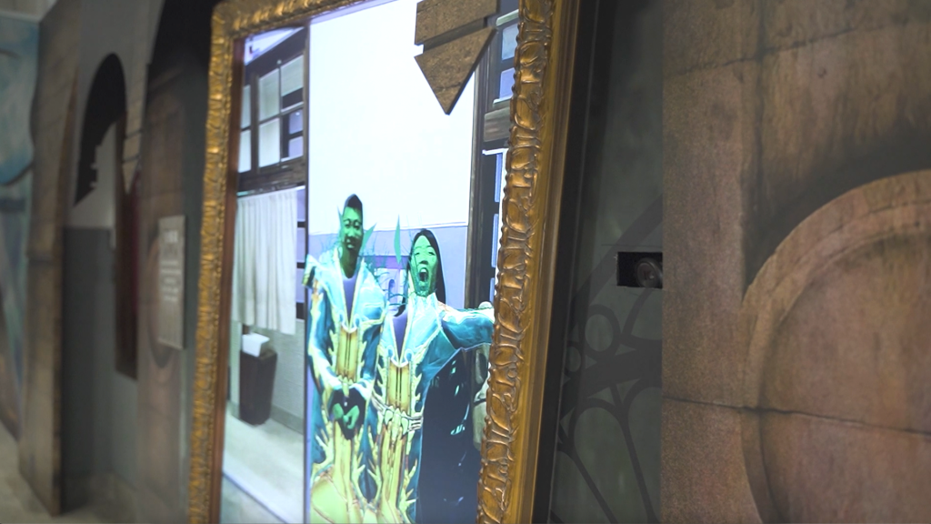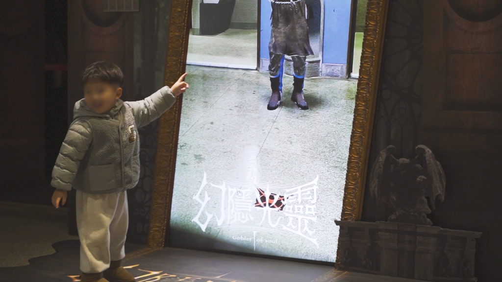 在展覽入口或休息區等開放場域,《幻隱光靈》提供「虛擬變裝鏡」模式。當觀眾走近鏡前,系統透過即時人體輪廓偵測技術,自動套用奇幻造型濾鏡,實現「無需操作、走近即變身」的流暢體驗。支援多人同框偵測與即時服飾切換功能,讓親友團可以一起入鏡、同時變身,形成高互動性的拍照打卡熱點,有效吸引人流駐足並延長停留時間。