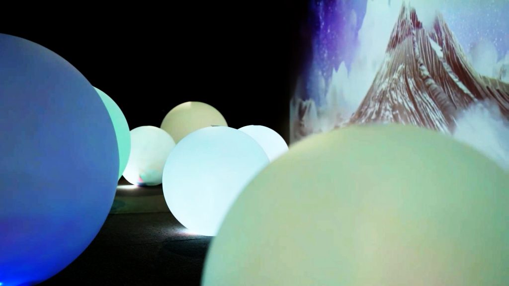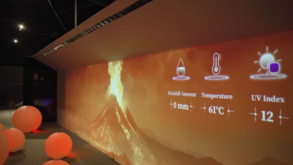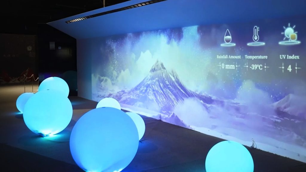 在火山口邊,見證水的變化旅程——我們在展區中打造了一面沈浸式環境投影牆,以火山噴發為開端,透過高解析動畫呈現水由氣態轉為液態、再凝結成冰雪的壯觀變化。場景不斷循環,形成劇場般的自然節奏。同時,場景前方的互動光球也會隨著環境溫度轉變同步變色,讓觀眾以視覺與觸覺同步感受溫度變化,認識「測量溫度」背後的原理與應用。