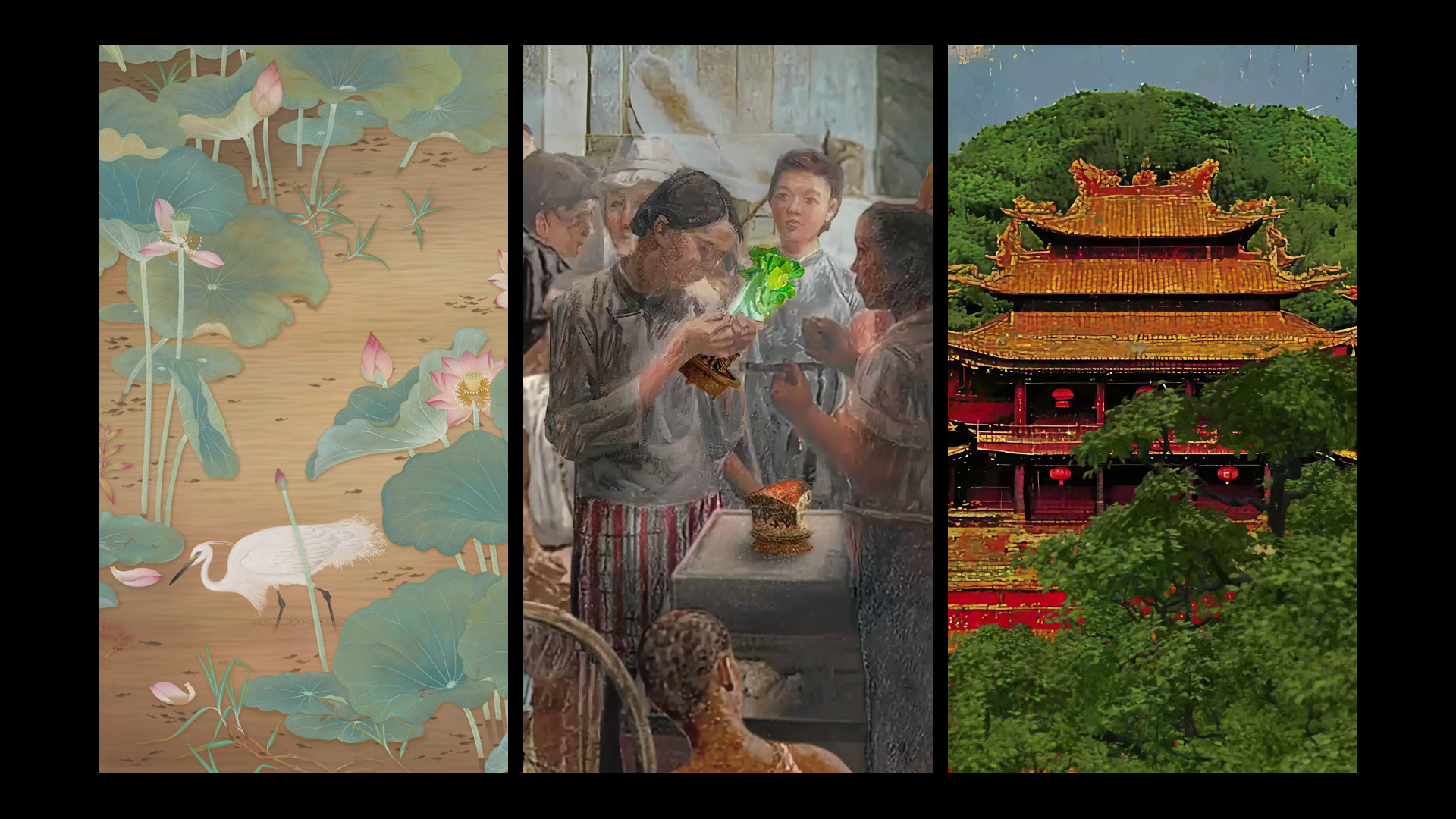 透過AI風格轉換技術,觀眾能欣賞到傳統文物在現代藝術語彙中的重生。靜態文物在時間序列控制與向量場驅動技術下,呈現出自然的呼吸、變化與流動效果,讓千年文物彷彿甦醒,展現全新生命力。